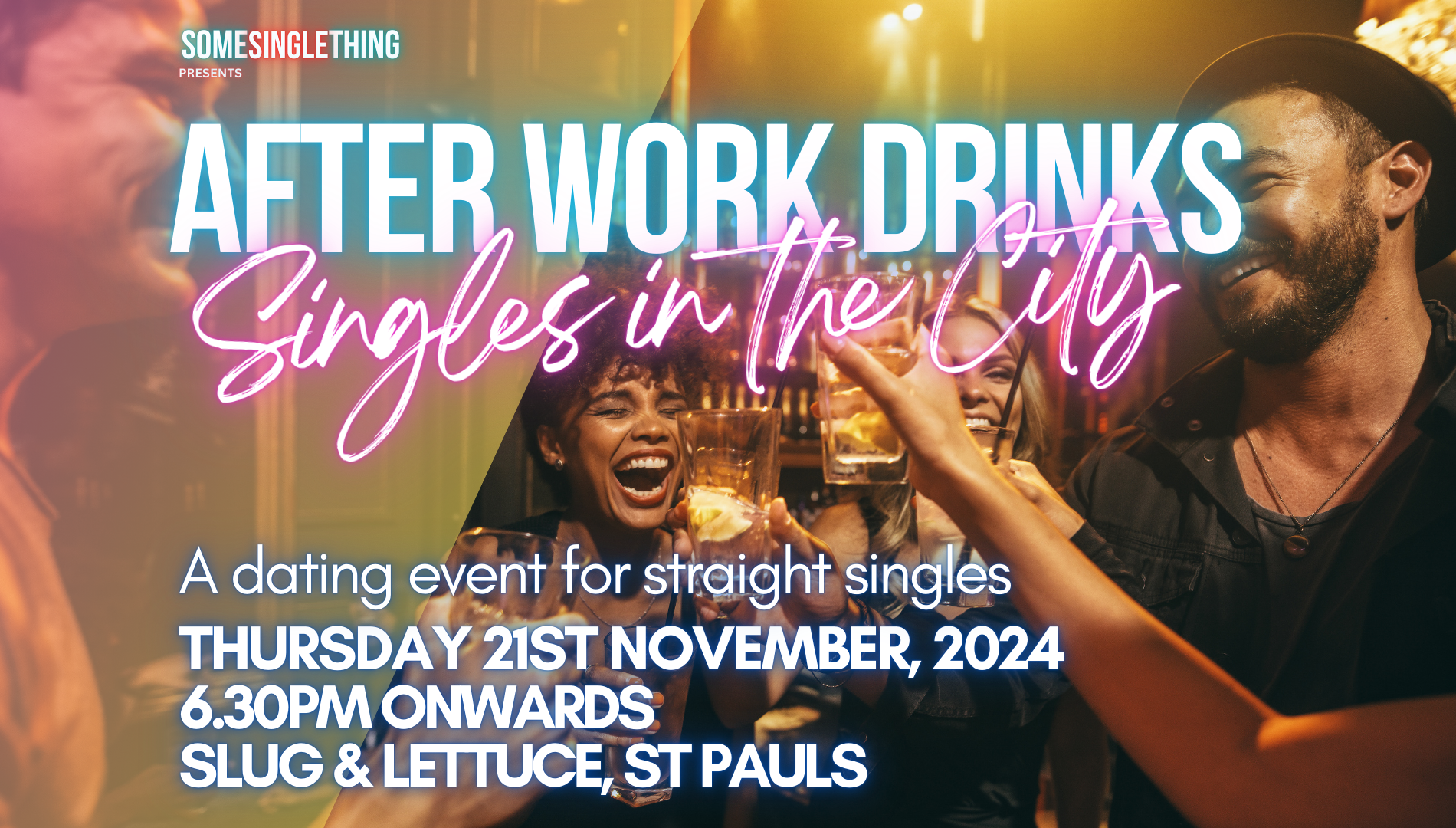 Some Single Thing, specialists in dating events, are excited to be hosting After Work Drinks for Singles in the City in the city of London for singles aged 25 – 45, and we’d love for you to join us.